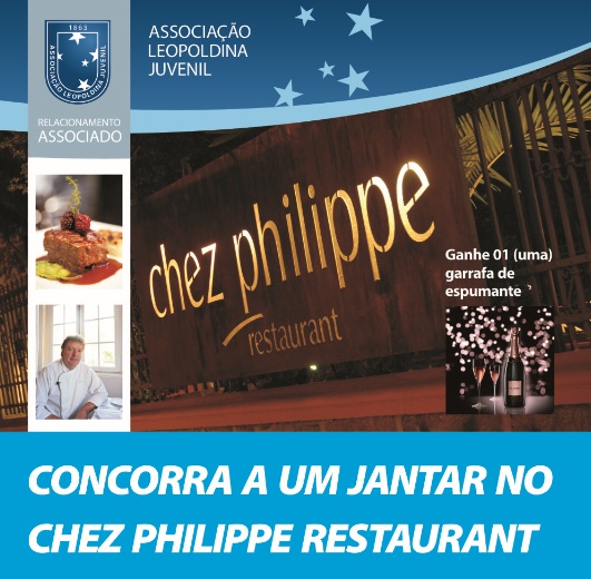 A Associação Leopoldina Juvenil está sorteando dois jantares para duas pessoas e uma garrafa de espumante no Chez Philippe Restaurant. Para participar, preencha os cupons nas portarias dos estacionamentos das Sedes Nova York e Marquês do Herval, ou envie seu nome, matrícula e número de telefone para o e-mail relacionamento@juvenil.com.br, até o dia 18 de novembro, domingo. O sorteio se realizará no dia 19 de novembro, e o nome do ganhador será divulgado nas portarias e no site da ALJ.