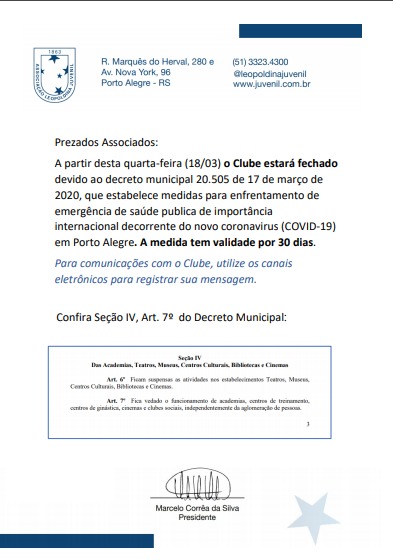 A Associação Leopoldina Juvenil está fechada a partir desta quarta-feira, 18 de março. A medida cumpre o Decreto Municipal 20.505, publicado em edição extra do Diário Oficial na noite de 17 de março de 2020, visando o enfrentamento de emergência de saúde pública de importância internacional decorrente do COVID-19.